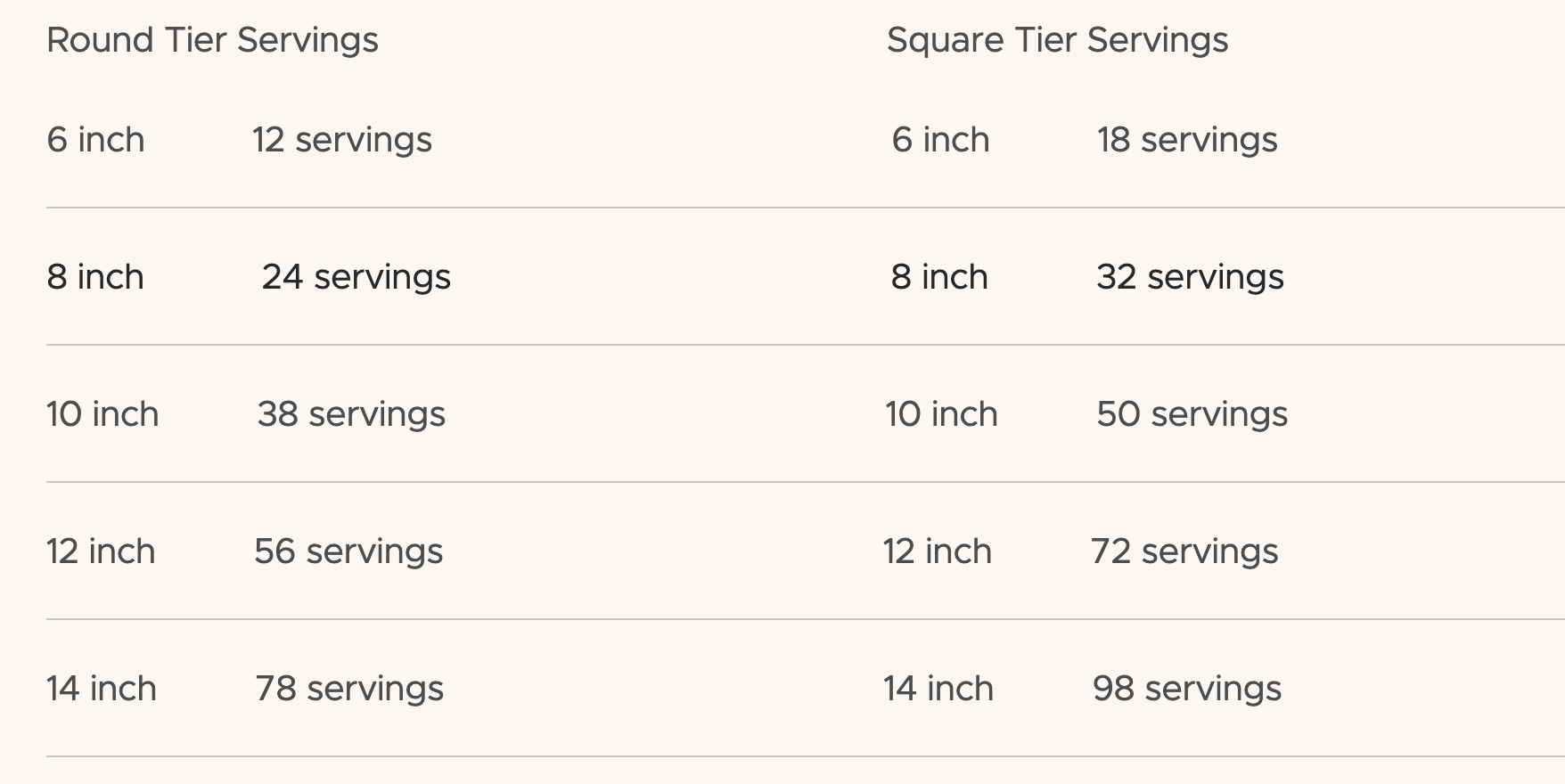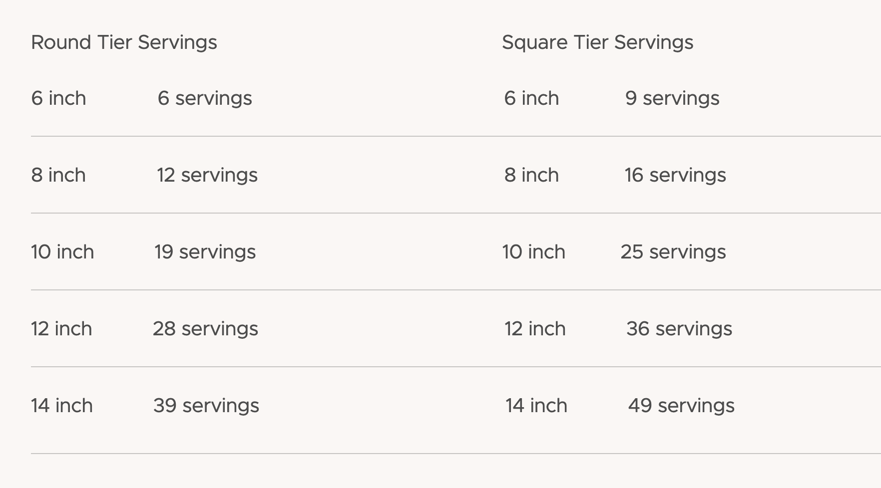 • 6" + 9" + 12" → ~100 servings (wedding portions)